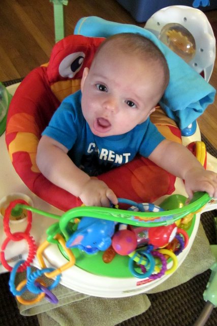on a super padded surface this time), talk to the mobile, or sing the nursery rhymes with the CD, 3)in the Bumbo to practice assisted sitting, or 4)in the Baby Bjorn or sling to walk around the neighborhood with Reese. All the time Mommy is talking to Andrew (or reading Facebook out loud to him) and he has started talking back and making up his own conversation. Andrew is learning and watching all the time and strangers always comment on how alert he is when we are out and about.