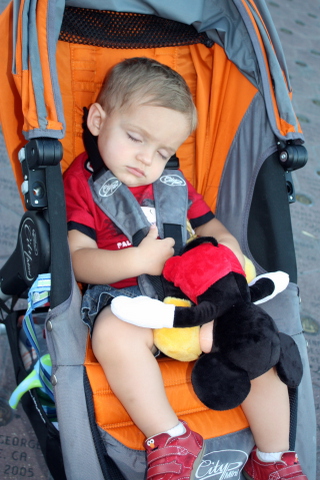 We also played with the rocket steam (misters), ate pizza for dinner, and ran around for awhile. We met back up with the gang for them to ride Space Mountain. I stayed with Andrew and Xavier outside. It was pretty funny to have both boys in their orange matching strollers in the exit of the ride because everyone that walked by looked and a lot of people asked me if they were mine (Xavier is much bigger than Andrew, but not big enough for me to have two, come on people!). An elderly couple, celebrating 60 years of marriage, sat down next to me and made faces at the boys--they loved it.After they rode, we headed back to California Adventure. There must be something about the middle of the parks that puts Andrew to sleep, because he was quickly out cold again (it might also have been the timing).